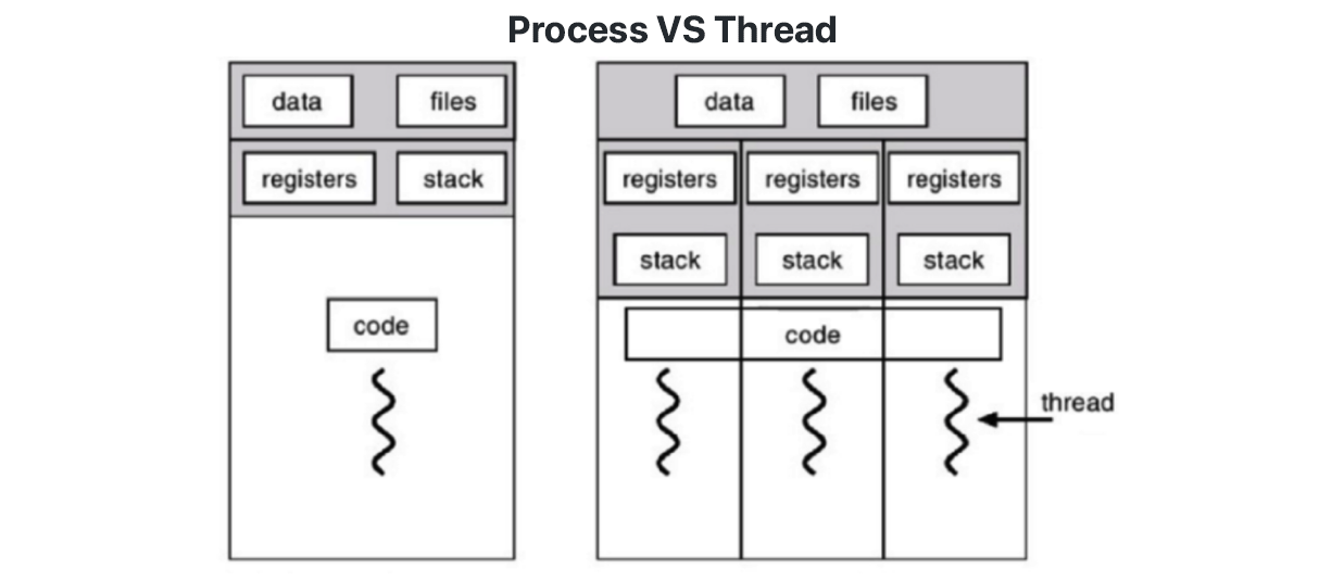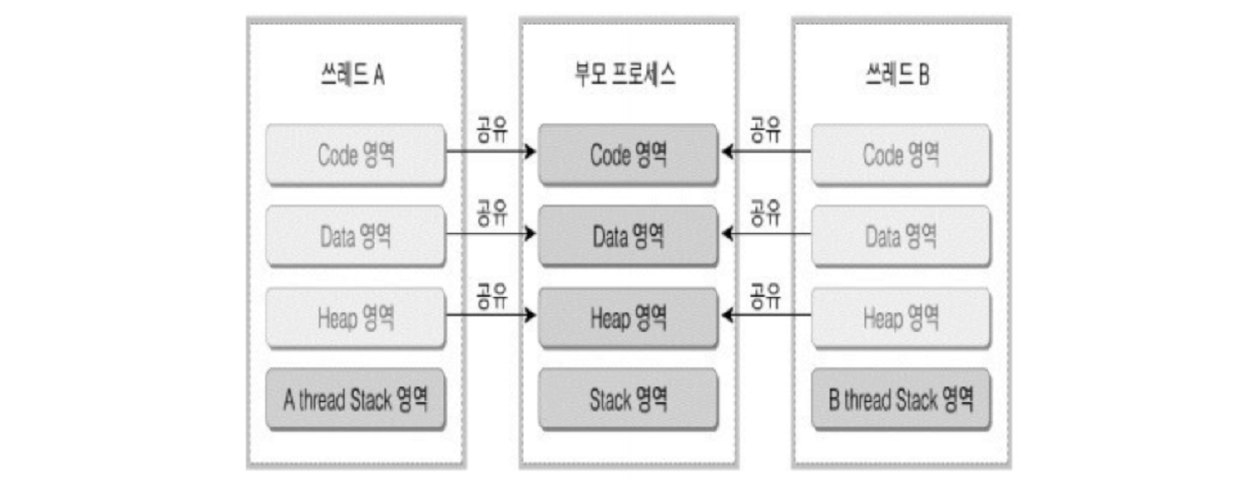 - 즉, 프로세스 내에서 병행 작업 처리를 위해 멀티 스레드를 사용하며 Stack 영역을 제외하고는 모든 영역을 부모 프로세스와 공유함.