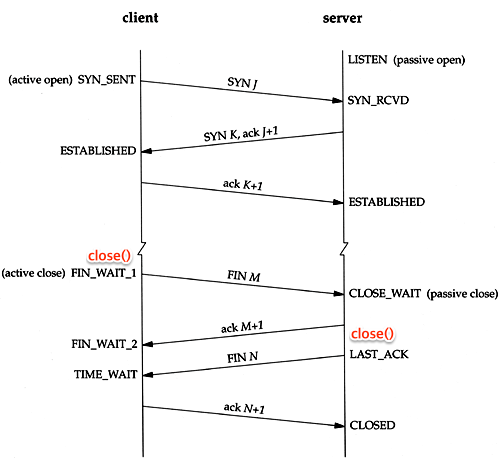 - FIN을 받은 클라이언트는 ACK를 서버에 다시 전송하고 TIME_WAIT으로 상태를 바꾼다. TIME_WAIT에서 일정 시간이 지나면 CLOSED된다. ACK를 받은 서버도 포트를 CLOSED로 닫는다.