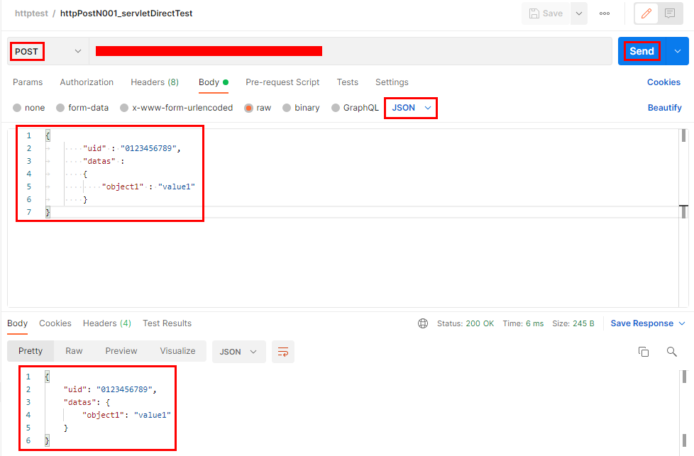 -생성한 servlet을 WAS(JEUS 6.0 Fix#9)에 디플로이 후 POSTMAN tool을 사용하여, 데이터 송/수신 출력 결과.(POSTMAN <-> WAS)