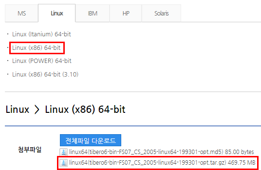 티베로6 설치 바이너리 다운로드 후 리눅스 서버로 이관.