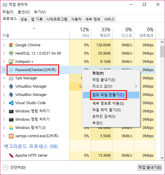 2.작업 관리자 실행 후 프로세스의 메모리 덤프 파일 추출.