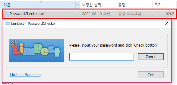 1.실행 파일(*.exe)을 실행.(작성자는 PasswordChecker.exe라는 실행 파일로 작업.)