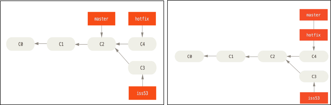 - case1. main 브랜치에서 hotfix 브랜치를 병합하는 경우, master 커밋의 포인터만 이동하여 병합할 수 있다.