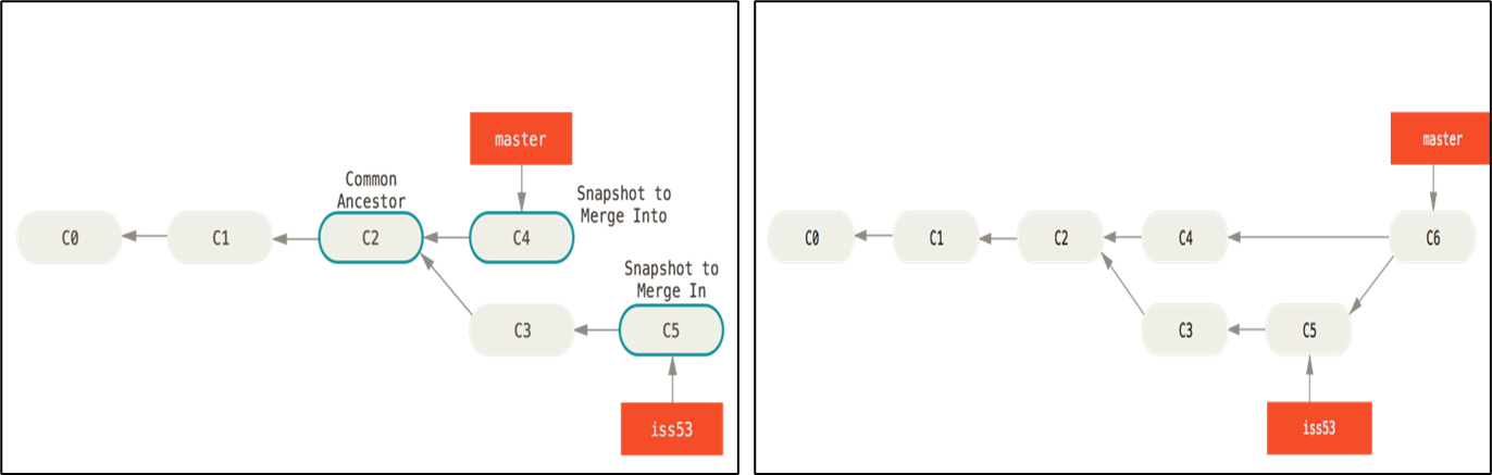 - case2. main 브랜치(C4)와 iss53 브랜치(C5)를 병합할 경우, C2 C4,C5를 비교하여 병합하고 그 내용을 커밋(C6)한다.