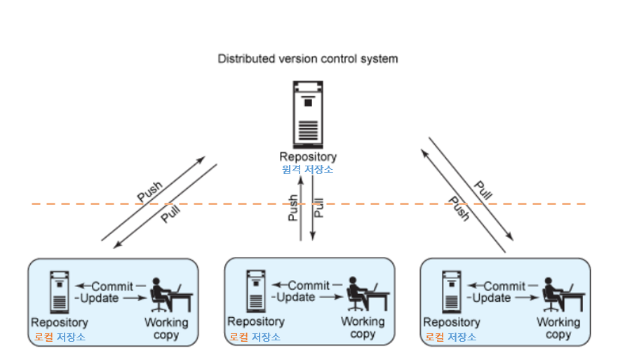 - 분산형 버전 관리 시스템은 하나의 저장소(Repository)가 아닌 분산된 여러 곳의 저장소를 통해 형상관리를 하는 것이다.