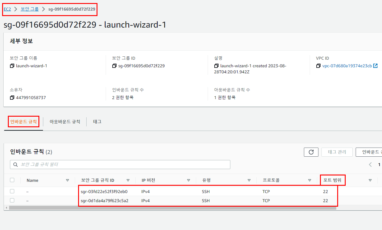 *ssh 접속을 위해, 22번 포트의 인바운드 규칙이 작성된 보안그룹을 등록.