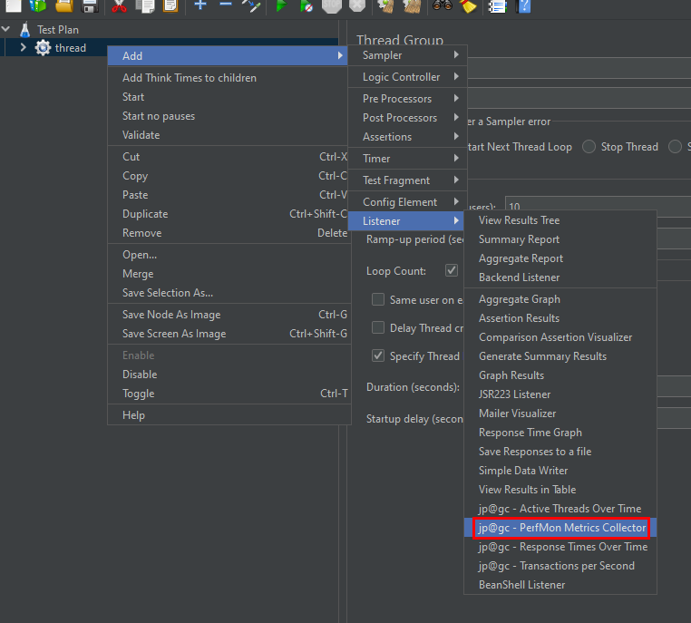 2.Test Plan의 thread에 Listener(PerfMon Metrics Collector)를 추가.